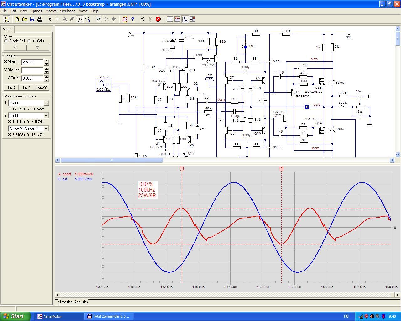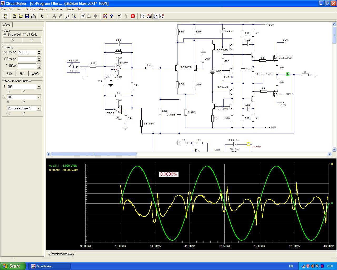Ha nekem sikerülne ilyen kis torzítású erősítőt kifejlesztenem, azonnal kidolgoznék valami komoly üzleti stratégiát, mert a 0.0004% THD az már nem a hobbi kategóriába tartozik, de bátran nevezhetjük High End minőségnek. Első lépésként senkinek nem mutatnám meg a kapcsolási rajzát, mert hát komoly terveim lennének vele. Ha már ennyire titkolnám a kapcsolást annak oka lenne, mondjuk szabadalmi védettséget kérnék rá. Talán egy világszabadalom megfelelő lenne.... ha értenék ennek a menetéhez, lenne erre kiképzett ügyvédem, jó néhány felesleges millióm. De mondjuk nincs. Talán ennél egyszerűbb és jobb megoldás lenne ha felvételre jelentkeznék valamelyik hifi berendezéseket gyártó céghez, mondjuk konstruktőrnek. Egy Marantz, Sony, Accuphase, stb... biztosan tárt karokkal fogadna. Csak megmutatnám nekik a kapcsolási rajzot meg a THD-t, oszt a jövő héten már kezdenék is. Vagy még jobb lenne az USA-ban, ott biztosan többet keres egy konstruktőr. De ha nem akarnék külföldön letelepedni, viszont az ebben rejlő komoly üzleti lehetőséget semmiképpen nem szeretném elszalasztani, akkor gyártanám. Sorozatban. Nyilván exportra, mert nálunk senki nem vesz névtelen magyar terméket. Legalább 10-20 év mire egy márkanevet be lehet valamennyire futtatni... persze lehet gyorsítani ezt a folyamatot reklámmal, bemutatókkal, állandó szerepléssel a hifi szaksajtókban, hájendsók, stb... és még számos egyéb módon. Esetleg nyitnék egy hifi szalont a nagy faluban, mert vidékre nem jár még a madár se. Ha igazán komolyan venném, hogy ebből akarok majd megélni 100-200 millióból már el lehetne indulni (valamerre). Persze a siker csak akkor lenne garantált ha 100%-ig biztos lennék benne, hogy valóban ez a világ legjobb erősítője. Ehhez persze rengeteget kell előtte otthon (szép csendben és titokban) tesztelni különböző műsorforrásokról, többféle hangsugárzóval, erre kialakított akusztikájú helyiségben, mindenféle műfajjal, különböző zenei ízlésű hozzáértő emberek társaságában. Ez is néhány év, vagy egy fél élet... ki mennyire veszi komolyan. Tehát a dolog nem annyira bonyolult, mint az ember ezt elsőre gondolná. Sokan meggazdagodtak már ebből, Nektek miért ne sikerülne? Most, hogy ezt így végiggondoltam magamban, világosan és tisztán látom magam előtt az értelmét a titkolódzásnak. A fenébe, hogy nekem miért nem jut eszembe egy ilyen jó kis földel kimenetű kapcsolás? Na de majd egyszer. És akkor én se fogom megmutatni senkinek, csak dicsekszek majd vele : )