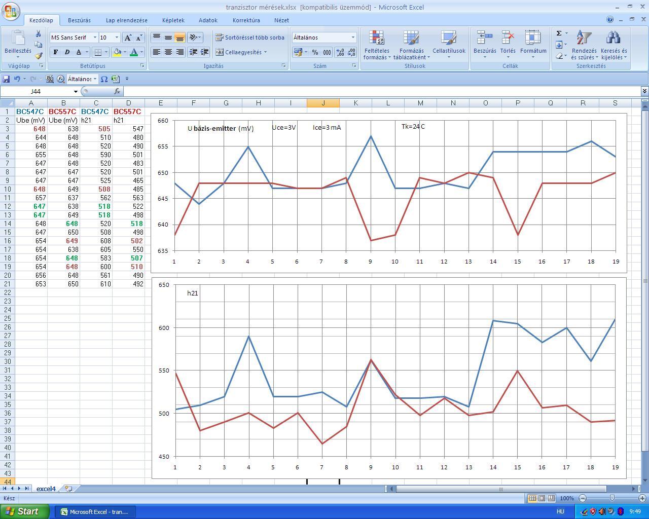 Ezek lesznek a bemeneti differenciál erősítőben (Q1-4). Behoztam a TESLA tranzisztor tesztert. 3 napig melegedett, bekapcsoltam 6 órával a mérés előtt... de még így sem volt egyszerű a mérés, mert ahogy odaültem elé, fél óra múlva két fokkal megnöveltem a környezeti hőmérsékletet... úgyhogy háromszor ellenőriztem át a méréseket, de szerintem még így sem halálpontos. Mondjuk lehet 2 mV szórása a bázis-emitter feszültségnek, de ez már elmegy. Úgysem az fog kijönni amit mérek -amikor be lesz ültetve a nyákba- de legalább igyekeztem. Mindegy. Majd kiderül. Érdekes (érdemes) megfigyelni, hogy az NPN Ube feszültsége nő a bétával, a PNP viszont fordítottan arányos (hozzávetőleg).