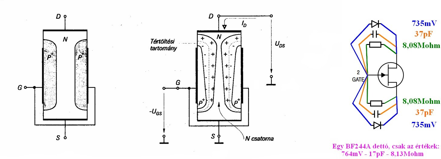 A gate-hez képest a drain és a source is hajszál pontosan ugyanazt a dióda nyitófeszt, ugyanazt az ohmos ellenállást, és ugyanazt a kapacitást mutatja! Akkor most melyik is a drain, és melyik a source? Az már csak hab a tortán, hogy pl. a BF244A-hoz az Onsemi és a Fairchild adatlapja is eltérő bekötést mutat.
