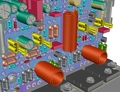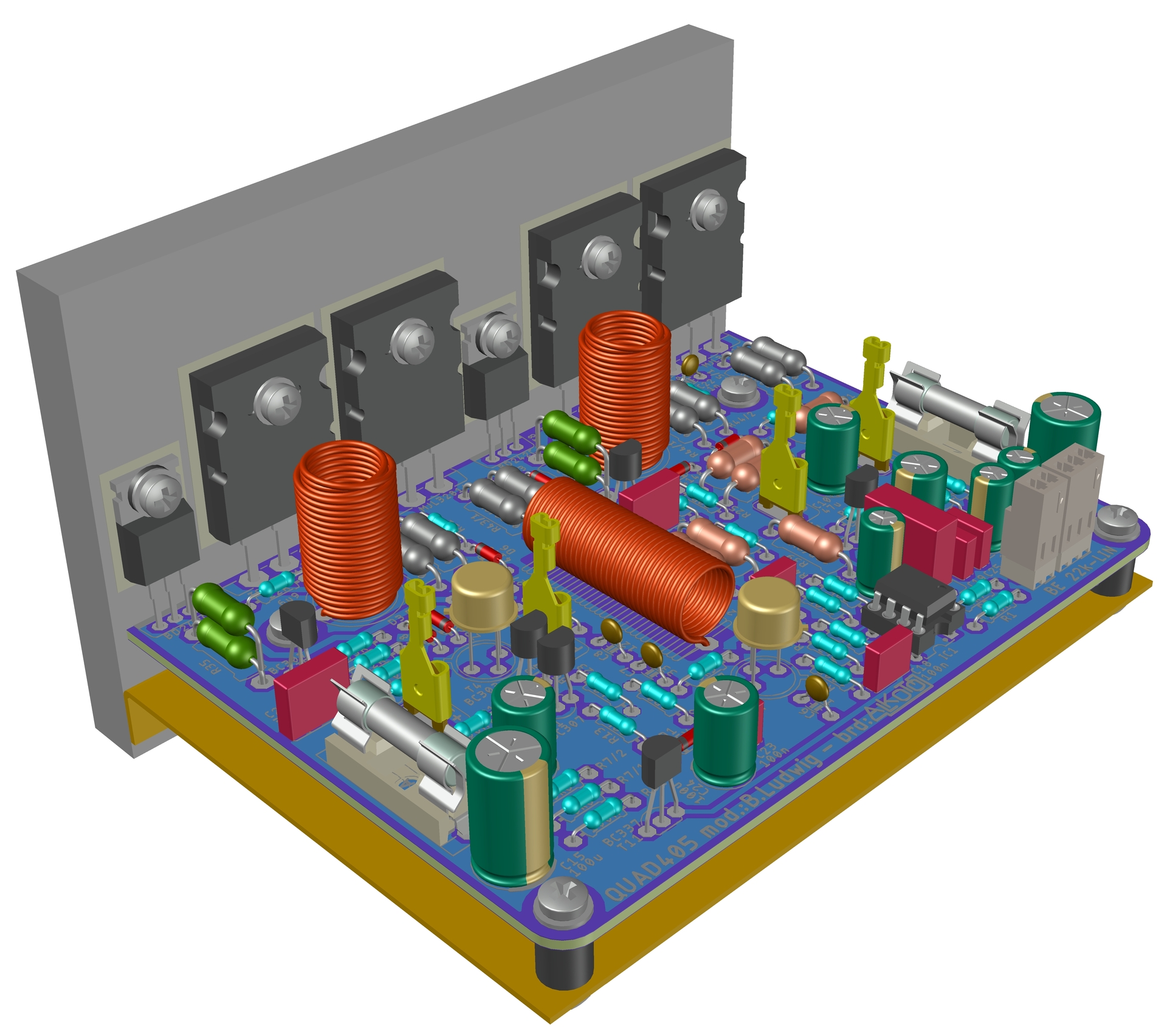Ez az eljárás vált be a Quad szinte bármely hibájának beazonosítására. VariációkÉpül itt-ott néhány példány még ebből az erősítőből, és engem is megtalált az igény. Ezért elővettem a közel 10 éves paneltervet, és belepiszkáltam egy kicsit. Akkor még egyoldalas, otthon is elkészíthető panelrajzolat volt a cél, ami mára már okafogyottá vált az elérhető lehetőségek miatt.Megigazítottam a régihez hasonlító paneltervet is, de szem előtt tartottam a kilógó rész levághatóságát. A kapcsolást kiegészítettem Reloop javaslata szerinti hangerőszabályozás lehetőségével (ami ki is hagyható igény szerint), és a bemeneti érzékenység növelését célzó javaslata is megjelenik az értékekben (szintén betehetőek az eredeti értékek is ha a 2 V-os érzékenységet akarjuk), valamint 2 további rögzítő furatot is feltettem, több alkatrészt elmozdítottam, a csatlakozó sarukat szépen sorba rendeztem, stb. Megpróbáltam a 3D-s megjelenítést is lerajzolni, mert így szemléletesebb a mutatvány. A közdarabos megoldást én ma már nem látom indokoltnak, ezért rajzoltam pirossal a közdarabot, és szerintem erre nincs szükség, valamilyen mértékben gátolja a hőátadást. Ezért levágtam a kiálló részt. Ezt a panelt már szerelhetjük fekvő elrendezéssel ha éppen ez illeszkedik jobban a bordánkhoz vagy a dobozolási koncepcióhoz, és merőlegesen is ha az a célszerűbb. Az eredmény szempontjából szinte semmi jelentősége, de igyekeztem az induktivitásokat is hitelesen ábrázolni, ami az én régi programommal egyáltalán nem volt egyszerű. Hasonlóan lerajzoltam egy késes csatlakozó sarut is, amiből éppen nem volt kéznél, így a méretei és az alakja részben az emlékeim alapján alakult ilyenre. Elsődlegesen szemléletesre akartam formálni, megtartva a pontos külső méreteket. Akinek van még jobbító javaslata, és el is mondja nekem, azt szívesen mérlegelem |