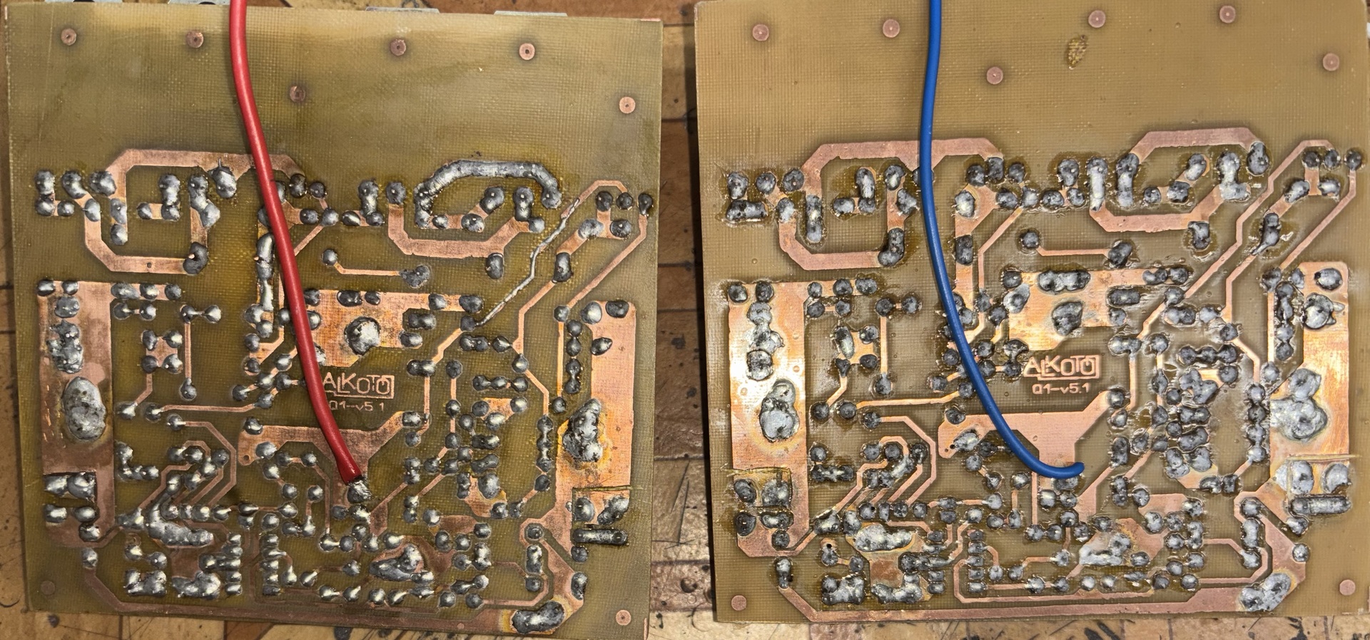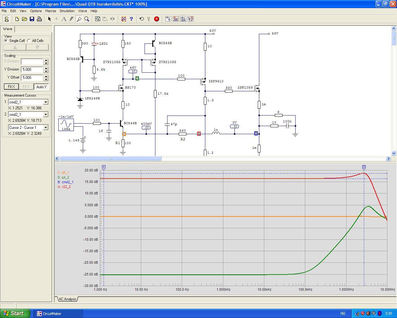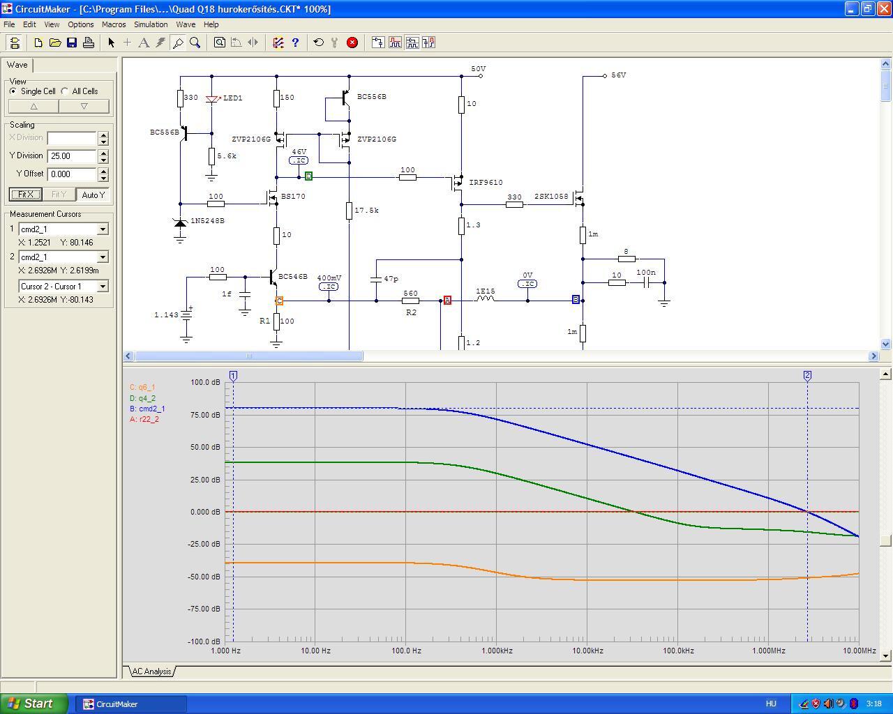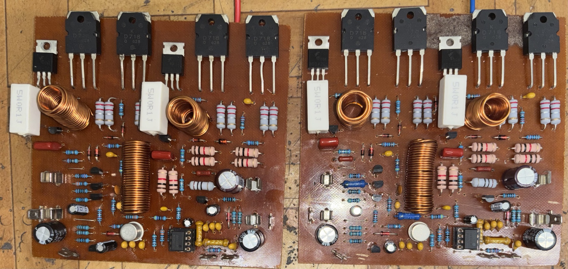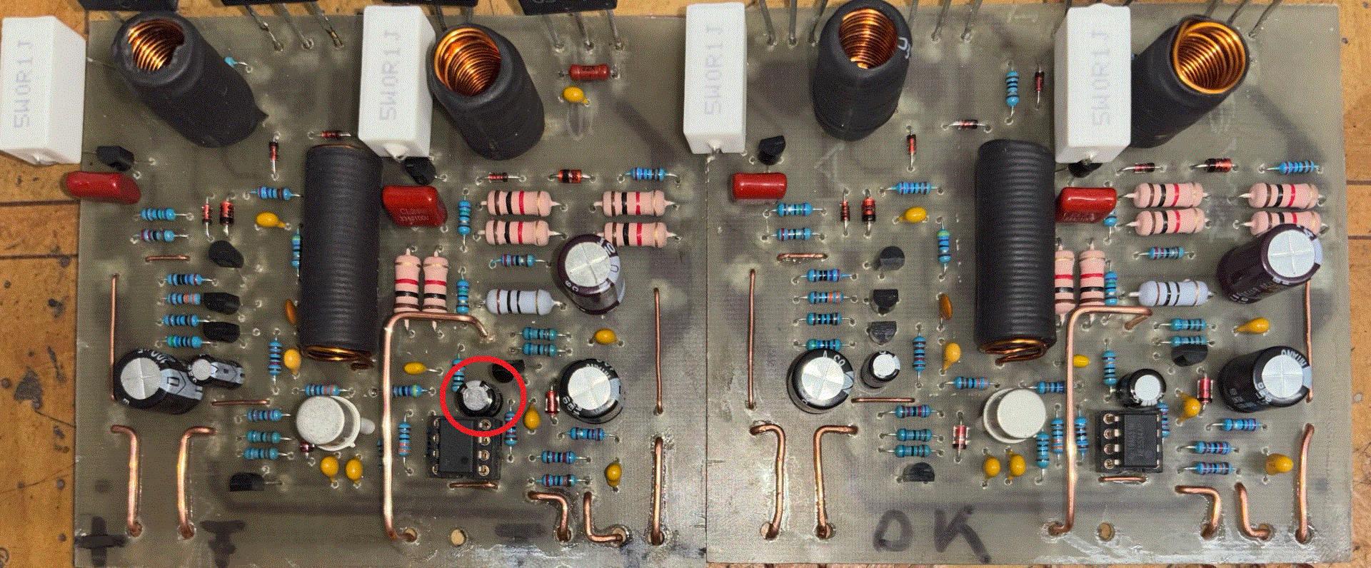 Építettem egy Ludwig féle quad 405 változatot. Kettő félét is egymásután. Mindegyik verziót egyszerre kezdtem el összeszerelni, ugyanazokkal az alkatrészekkel tükörképben. Mindegyik verzióból az egyik működik, míg a másik nem. A gyári verziótól elétérve a 0,063ohm ellenállás helyett 0,1ohm használtam, sajnos nem tudtam beszerezni ilyen kicsit. A végfokok helyett másikat használtam. (nem TIP35 lett, mást tettem bele) Műveleti erősítőnek pedig NE5534 Próbaként 2x35V kap, de ha megfelelőlen működik akkor kb 50V körül fog majd kapni. Kérdésem pedig, hogy hol kezdjem el a hiba keresését? Csatolva a kettő végfok alkatrész szerelt nyákja.