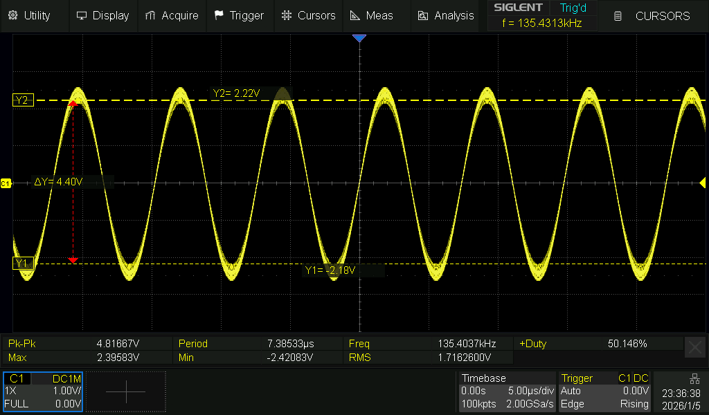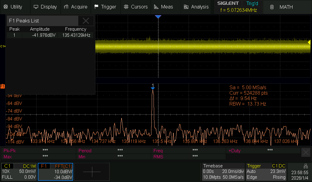![]() Közben addig mókoltam, míg sikerült egy 4.8Vpp tiszta szinuszt kiszedni a körből (csatoltam róla képet). És biztos a HGA22, mert WebSDR-el összenéztem mikor megy a modulálás, és stimmel. ![]() Szóval a mérés előtt raktam még egy BC337-es erősítést (ez vót' itthon) a BS170 után úgy, hogy a kollektor körbe raktam egy Thomson képlet alapján kiszámolt LC kört. Addig cserélgettem a kondikat meg forrasztgattam, míg egyszer csak kilőtt a 135.6 kHz (vagyis kb. 135.44 kHz) ![]() A forrasztgatásokra elég érzékeny, dehát a levegőben lóg minden jó hosszú alkatrészlábakkal, ráadásul az LC tagban az L nem árnyékolt fajtájú. ![]() Majd ha lesz időm összedobom a kapcsit érdekességképp. Aztán a következő verzió már valami lyukraszteresen összerakott JFET-es lesz, arra mehet a demodulálás és dekódolás is.