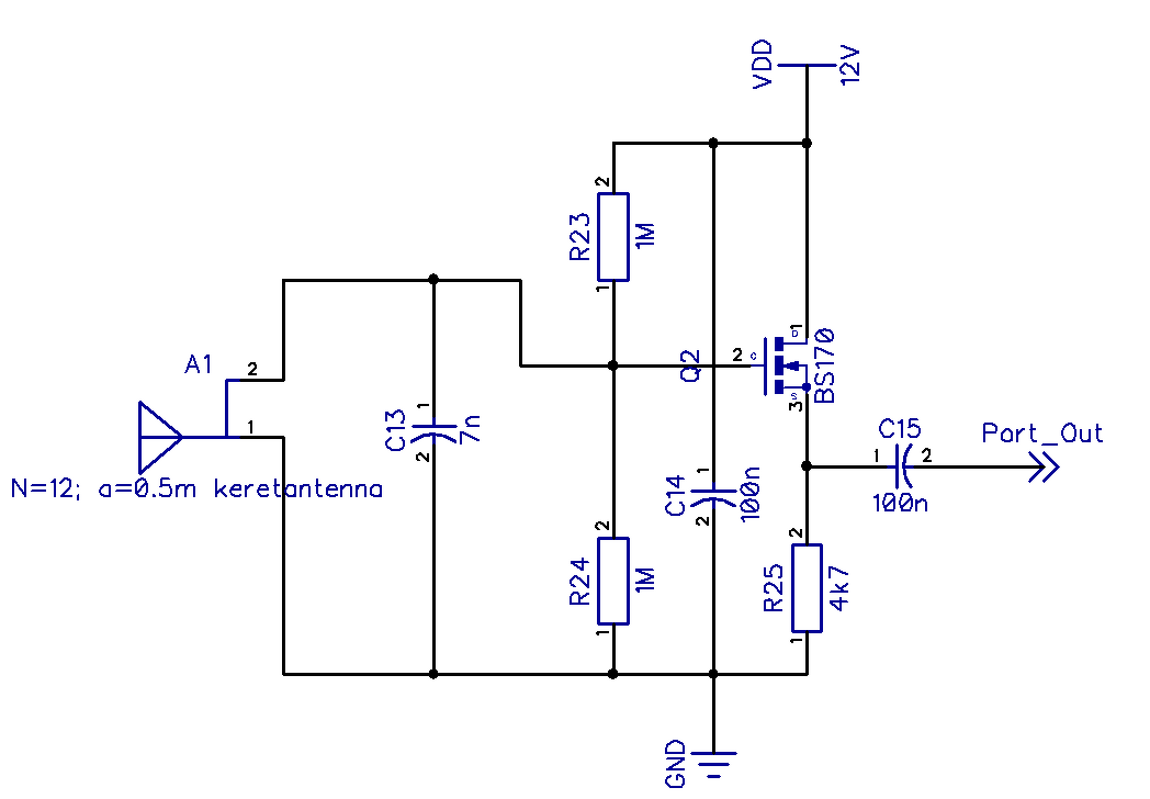 Ezt csak úgy kísérletezgetésképp csináltam. A keret (vagyis négyszög) oldalai 50cm, és 12 menet 0.2mm-es lakkozott rézhuzal van rátekerve egymástól 3mm távolságra, ilyesmi elrendezésben: Bővebben: Link. Mivel nem volt otthon JFET-em, ezért egy BS170-et raktam be, a rajzon lévő kapcsolásban. A kondi pontos értéke nem is tudom már mennyi, de valahol 7nF körül van. Oda kéne egy forgó/trimmer kondi, belőni a pontos rezonanciát, de az meg főleg nincs, próbálgatni kellett diszkrét értékekkel. Szóval simán lehet hogy a rezonanciafreki közelébe se vagyok. Arra gondoltam, hogy a FET csere után rakok még egy LC körös JFET-et, valahogy úgy, hogy a JFET Drain - táp pontja közé rakok egy párhuzamos LC kört a 135kHz-re hangolva. És akkor az impedancia leválasztás után lesz egy erősítés is. Meg kipróbálom, hogy 4066-os IC-vel összekeverem ezt meg egy pl. fix 134kHz-es jelet, aztán arra egy (vagyis több) szűrő. ![]() Szóval ez részemről még csak kísérletezgetés, mintsem komoly tervezés. Majd aztán levonom a konklúziókat, és nekiállok valami komolyabb verziónak. Szerk.: most nézem, az a C14 jelű 100 nF kondi megtévesztő lehet, de az csak a tápot szűri. A hozzászólás módosítva: Jan 5, 2026