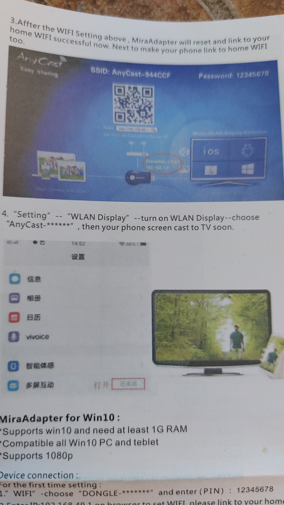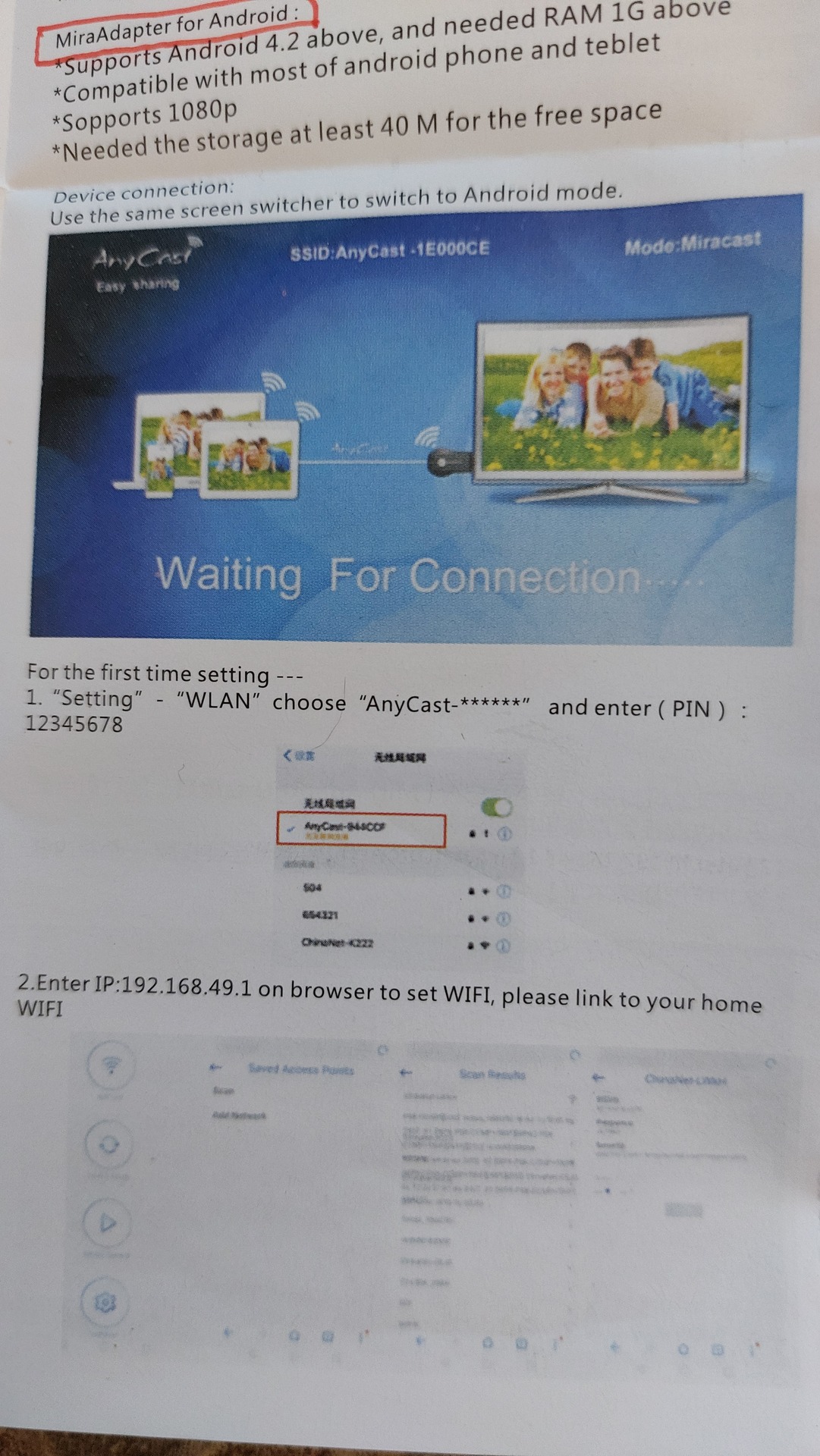 Vettem egy ilyet. Összedugtam a tévével, adtam neki tápot, az egység által kiadott kép meg is jelent. A hozzá adott doksi nehezen, de valamelyest olvasható, a biztonság kedvéért megnéztem 4-5 tutorialt a youtube-on. Ha jól láttam, úgy történik a telepítés, hogy ezt az eszközt először a telefonnal kell csatlakoztatni. Ezt úgy csinálják, hogy a telefonnál a wifi menüpontba belépve vagy megjelenik egy "AnyCast....", vagy új hálózati eszközként fel kell venni. Sajnos nekem nem semmit nem sikerül csatlakoztatni úgy, hogy SSID: AnyCast66E5633D ill. az 12346578. Mit csinálok rosszul?