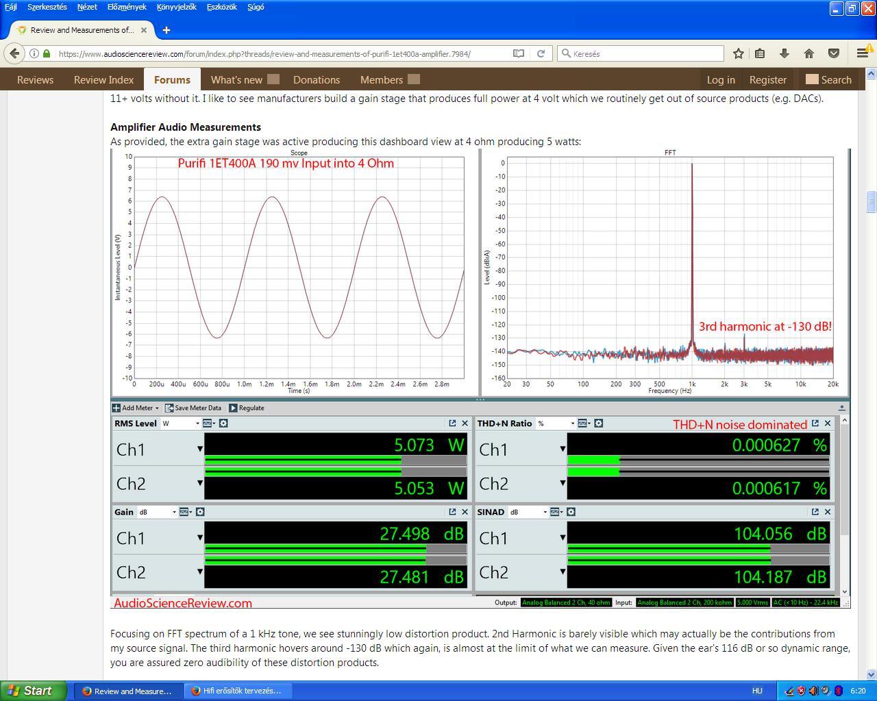 Idézet: „Én továbbra is azt mondom, hogy a kis THD igenis számít. Ha a lánc többi eleme is jó minőségű, a különbség a 0,005% és a 0,0005% között nem „képzelődés”, hanem simán hallható.” Magam is kezdem azt gondolni, hogy túl sokat foglalkozom veletek és ennek semmi értelme. Ugyanakkor azt is szeretném, ha (kapcsolási rajz híján) valami mással győznétek meg minket arról, hogy amit írtok az valóban fedi a valóságot... mondjuk mérési eredményekkel. Készséggel elhiszem, hogy Skori jobb PWM végfokot tud tervezni mint Bruno. Ez itt a Purifi - szerintem teljesen hiteles - mérése. Ha továbbra is fenntartod a fent idézett állításod, akkor Skori végfoka ennél is kisebb torzítású. Megmutatnád nekünk ezt a mérést? Ne írd újra azt, hogy ellenséges vagyok : ) https://www.audiosciencereview.com/forum/index.php?threads/review-a....7984/ |