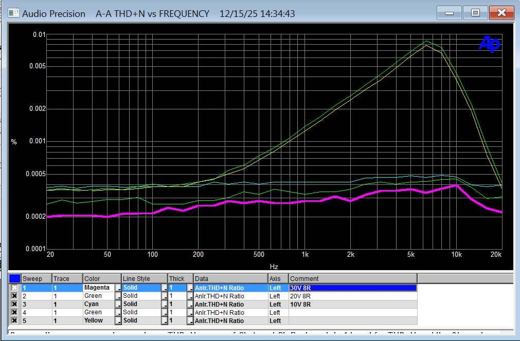 Idézet: Sosem állítottam, hogy a mi class-d végfokunk kisebbet torzít mint a purifi. Viszont sokkal jobban szól. Azt viszont mondtam. Az A-B végfokról tettem fel teljesen hiteles AP műszerrel mért méréseket, aki kicsit is benne mozog ebbe a témába tudja, hogy nagyjából etalonnak számít ez a műszer és az általad linkelt mérések is azzal készülnek. Annyi, hogy engem nem egy torzítási adat érdekel, én mindig végigmérem a teljes frekvencia tartományban. De teszek fel újra Neked mérést. Ezen látszik az A-B végfokunk és a Class-D is egymás mellett.„Készséggel elhiszem, hogy Skori jobb PWM végfokot tud tervezni mint Bruno. Ez itt a Purifi - szerintem teljesen hiteles - mérése.” A legalsó magenta az a 30V 8R kimenet az A-B-n a fölötte lévő zöld az a 20V 8R A-B a fölötte lévő Cyan a 10V 8R A-B A zöld és a sárga 20V 8R fél híd class-d. A fullbrdige sokkal jobb, azért a félhíddal hasonlítottam, mert az ab végfok is félhidas. Ezeken az ábrákon a THD+N mérést látod (NEM THD!!!!) a frekvencia függvényében van végigmérve, ahol a skála legteteje is csak 0,01%!! Szóval mégegyszer: soha nem állítottuk, hogy a mi class-d-nk kisebb torzítású. Amúgy ez a class-d ugyanezt vagy ennél jobb torzítást tud 1500W-on is!