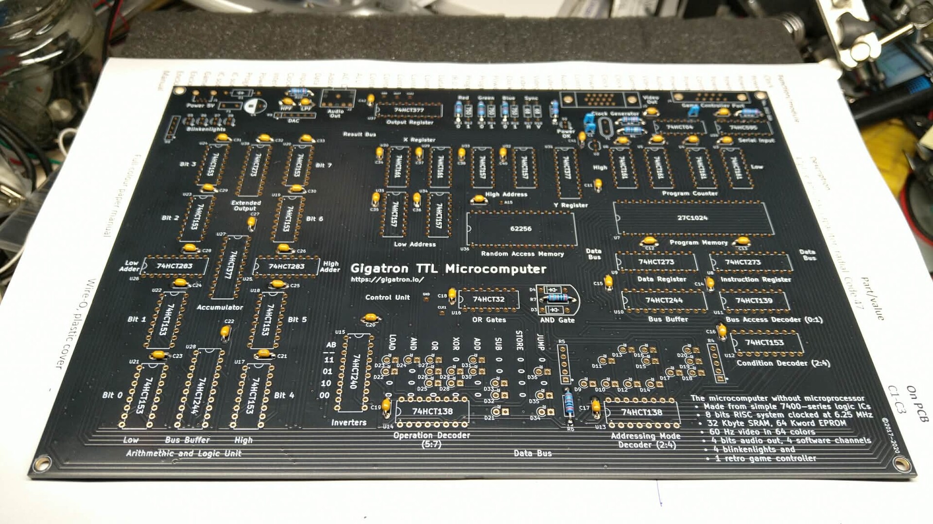 rászántam magam, hogy építsek egy ilyen kis készüléket: Gigatron honlap Egy kis TTL számítógép, már open source lett, beépített játékokkal, alapvetően kevésbé hasznos, inkább mókás, de akár tanulási-oktatási célra is jó lehet. Itt van egy videó is az összerakásról, működésről. Rendeltem NYÁK-lapokat hozzá, ha van még lelkes, megfelelően elvetemült/elszánt kolléga, tudok majd beszerzési áron adni belőle. Kb. 4-5000Ft lesz, fekete lakkal, aranyozott kivitelben. (10 darabot rendeltem, szóval max. 9 lelkes jelentkezőt tudok ellátni. Az alkatrészek saccra. 20 ezresbe kerülhetnek még hozzá - ezt mindenkinek magának kell beszereznie. Hogy legyen kérdés, kérés is, ha esetleg van aki fel tudja programozni az EPROM-ot, az is segítség lenne.