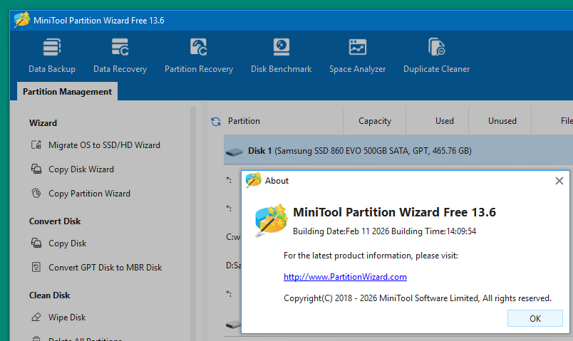 Ez a MiniTool 7.6 verzió. Most éppen a 13.5 az új verzió. Valamit csak csináltak benne. A 13.0 verzió is már egy éves.