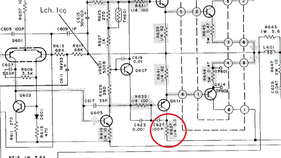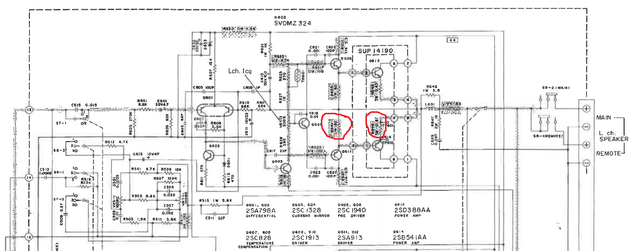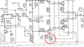 Próbáltam a "service manual"-ból a kapcsolási rajzát összeollózni és bejelölni rajta pirossal azt a két ellenállást, ami elfüstölt benne. A végtranzisztorok és a meghajtó tranzisztorok úgy tűnik túlélték, nem forrasztottam ki őket, csak a helyükön mértem és nem zárlatosak. (Nagyon nehéz hozzáférni az alkatrészekhez azért is nem forrasztottam ki őket.)