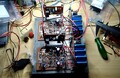 Amíg van alapanyagom addig a magam részéről maradok a papír-fenolgyantánál. Öregem pár hete a lábát törte, semennyi időm sincs, be sem kapcsoltam a Sansui-t már közel egy hónapja. Mondom, ha úgysem kapcsolom be, akkor szétbontom, és esténként (mese helyett) dolgozgatok vele egy kicsit az átépítésén, bedobozolva még mindig nem lesz, mert még a felső lemez lap sincs leszabatva, de hogy legalább szállítható állapotba kerüljön. Az egészet tápostól védelmestől ráépítettem egy 22x19 cm-es bordára, csak a csatlakozók (RCA, hangszóró) meg a trafók lógnak majd körülötte. Mielőtt mekkelek rámförmedne, nem, nem fognak a bordától elmelegedni az elkók, mert egyrészt van köztük 3 centi levegő, másrészt fejtetőn lesz az egész, a borda kívül a doboz tetején, a többi pedig bent lóg majd a dobozban. Meg kicseréltem a kábelezését is.