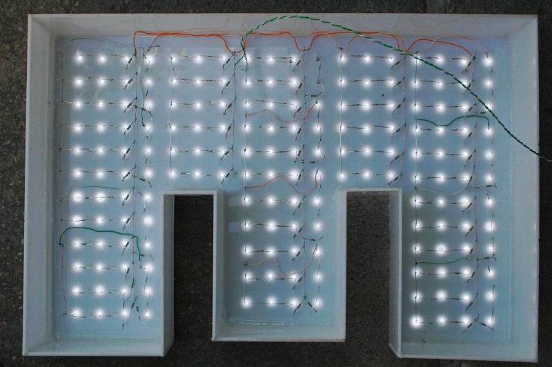 Most lettem kész egy barátomnak segítve egy reklám felirat E betűjével. Sok sok led lesz összesen 1100körül. A fénykép nem tükrözi a valóságot. A valóság, hogy nagyon szép szemből, mivel a szemünkön lévő folyadék miatt kis csillagosak a ledek fénye.Brutál szép. 3 led sorba és 200ohmos ellenállás még rá, és stabil 12v-ot fog kapni. A képen 2 led nem világít, mert nem jól jött ki nincs 3. párjuk.