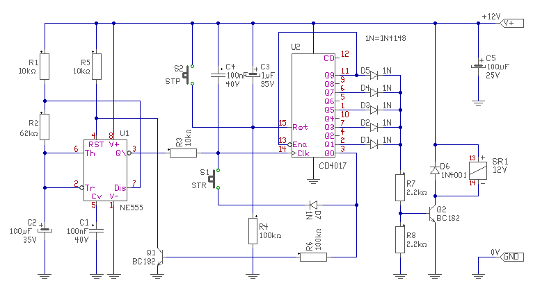 A 220 K helyére potit rakva 100K nál szerintem kb 1Hz vel villog a led Kb 2 óra után addig amíg meg nem nyomod a gombot vagy 2 óráig.Az időt állítva változik a villogási sebesség.Gombnyomásra újraindul,de ha bekapcsolod célszerű azzal kezdeni,vagy a gombbal párhuzamosan kötni egy 100 nF kondit. szerintem 9-15 V ig kellene működnie ( igazából csak a led fényerejének kellene változni 5-15 V ig.)