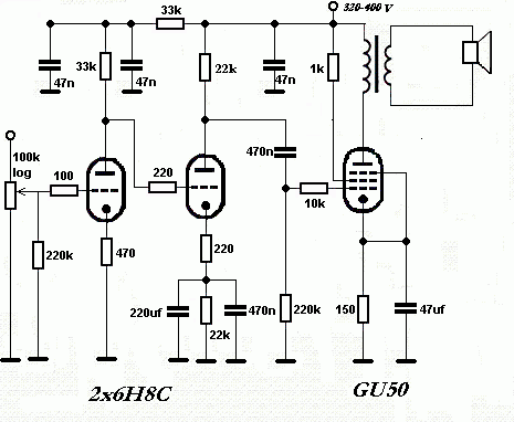 Én inkább maradnék a 6N8C-nél, mert az ECC 83 nagy belső ellenállásával nemigen lehet a GU 50-et normálisan meghajtani, az inkább fesz. erősítők első fokozatában érzi jól magát (1 mA környéki nyugalmi árammal szeret működni, a nagy erősítését csak így lehet kihasználni (mű=100)), vagy kisebb cső, pl. EL84 meghajtására (bár én ott is inkább ECC 82 párti vagyok).