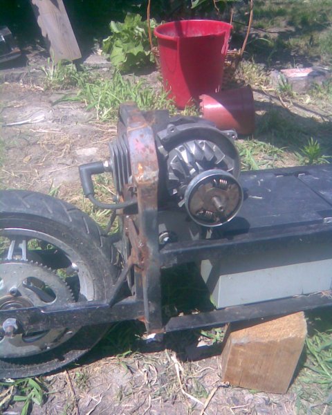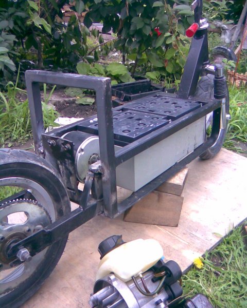 Igaz ezek a képek még csak az építési szakaszt mutatják félkész állapotban./ha valakit érdekel rakok fel kész képeket is/De a kész verziónál elektrodinamikus fék van.Mellesleg egy akufeltöltéssel 60-70 KM-t lehet megtenni lenerülés előtt viszont az MTD790-es motorral /benzin/50-60-al lehet menni,/mellesleg az aksikat fél óra alatt feltölti (1,5 dl benzinnel)és megint lehet vele 60-70 KM-t menni.