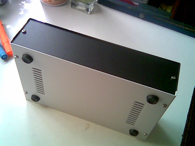 Már mindenfelé keresgettem valami borítást (dobozt) az erősítőnek, de hiába. Végső megoldásként előbányásztam egy cdrom meghajtó borítását, és befedtem egy fekete műanyag öntapadós fóliával. Ma beugrottam a helyi (Hatvani) elektronikai üzletbe hangszórót nézegetni, és rákérdeztem, hogy van e ilyen doboz. Hát volt. Van fémes, és műanyagos is, minden méretben, és formában, és fele anyiba kerül, mint az interneten. Gyorsan vettem is egyet, és most fülig ér a szám! ![]() Ebben el fog férni minden, és jól is fog kinézni!