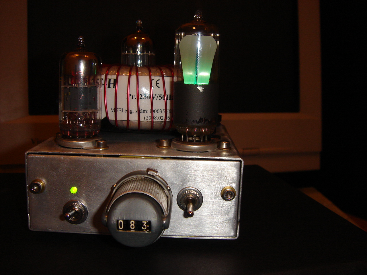 . Az órmótlan számlálós bigyó az előlapján a bemeneti érzékenységet állítja úgy hogy egy sztereó 50K-s potit tekerget. Véletlenűl 000-tól pont 083-ig megy (...tudod, EM83 ). A bal oldali kapcsoló három állású (alsó helyzet fűtés, középen off, felső fűtés + anódfesz) a jobb oldali kapcsoló pedíg az EM83-as 6-os lábára ad vagy nullát vagy az anódfeszt. Így változtatható az érzékenysége -16 Volt vagy -8 Volt között. Az EM83 mögötti kis 1 Megás poti a varázsszem rácsára megy az előfok jelét leosztandó.Mielőtt kérdeznétek a toroid körül annak a piros huzalnak kizárólag esztétikai szerepe van (számomra) meg indukálódik benne úgy 20V és ha nem figyelek összeér és forrósodik .