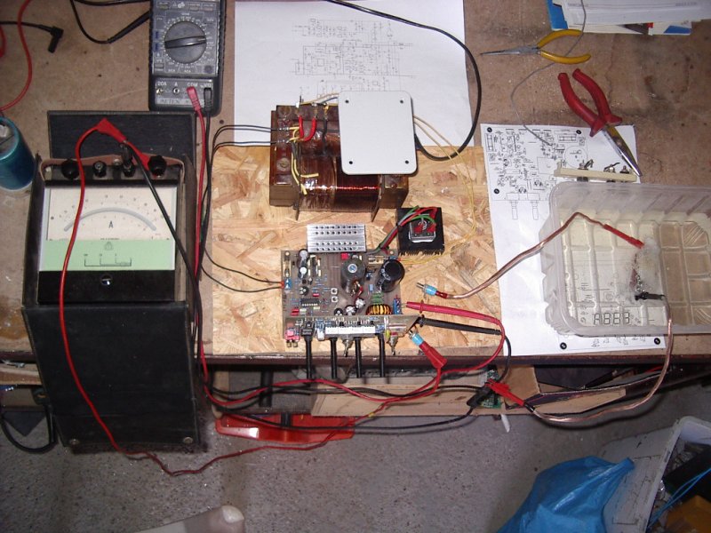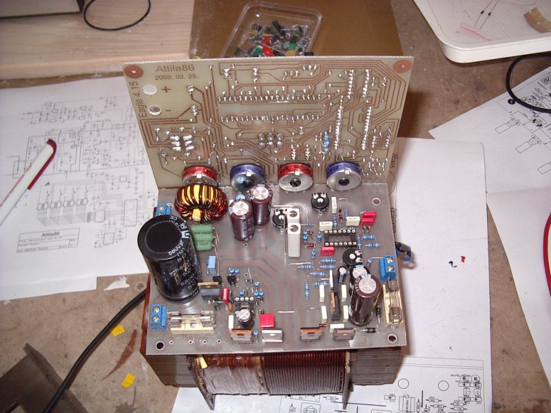 Én is megépítettem Attilla 86 kapcsolóüzemű labortápegységét(köszönet neki) igaz, még a panelmérőhez még nincs meg a 7135-ös IC , de attól már kipróbáltam.... A képen próbaterhelésnek teljesítményellenállást merítettem víz alá, hogy a 40V 5A-ál keletkező hőt le tudjam kezelni.... Alkatrészoldali teliföldet nem csináltam, (elnézést Attilla mester) mert még volt egy csomó egyoldalas nyák- lemezem.. Stabilitása kiváló az áramkörnek, és alig melegszik..(legforróbb a 35A-es gratez volt). Hátravan még a kijelző panel élesztése, és a dobozolás..