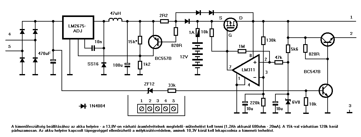 A trafó primer tekercsén kikapcsoláskor indukálódott feszültséget egy diódán keresztül vissza kell vezetni az akkumulátorba. Tudom ez kényszerhelyzet (már ami a primer és a szekunder menetszámokat illeti),de működik,és ha terhelés nélkül működik a kapcsolás akkor sem megy tönkre a fet. Igazából ezt a takercset,aminek az elnevezése:lemágnesező tekercs párhuzamosan szokták felhajtani a másikkkal,egyforma menetszámmal,hogy minél jobb legyen a csatolási tényező. Mint már irtam ez egy kényszerhelyzet,tehát ezt nem lehet megtenni. Attól nem kell félni,hogy a túl nagy feszültség kárt tesz az akkuban,mert a kicsi belsőellenállás elnyeli az impulzust. Másrészt a primer tetemes induktivitása határolja a létrejövő áramot.