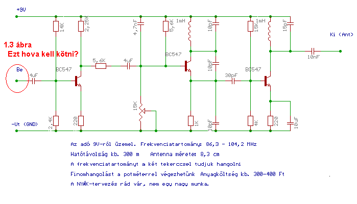 http://www.hobbielektronika.hu/katalogus/alkatresz_174.html Kondi: az első kettő elektrolit, a többi lehet kerámia. Tekercs: mH, azaz millihenry. 1.1 ábra: beállító ellenállás, ( timmel, trimmel ) potenciméter. A csúszka és az egyik vége a földre ( - táp ) van kötve. Nem szabványos rajzjel. Antenna: egyszerű vezetékdarab, lehet szigetelt. A 8 cm elég kicsi, még antennának is ezen a frekvencián Tekercs: a menetek széthúzásával és összenyomásával hangolható. Már nem emlékszem milyent csináltam, talán 4-es belső átmérőre 5 menet vagy hasonló. Vastag, 0.8-as zománc szigetelésű huzalból öntartóra faragható. Be: valamilyen hangforrás ( magnó, lemezjátszó, számítógép, stb. ) egy ( pl. bal ) csatornája. A földet is be kell kötni.