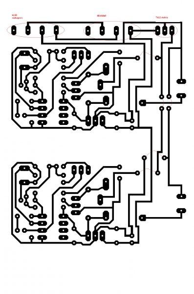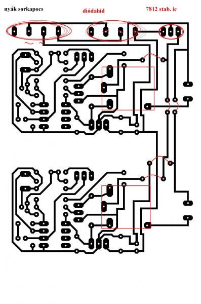 ...de ez így nagyon nem frankó. A ventilátoroknak betettél egy külön 12V-os stabkockát, ez még idáig jó. Na de a "nyák sorkapocs" miért négy PAD-ből áll, amiből ráadásul az egyik nincs bekötve? A középső kettőnél van egy kis szinuszjel, ez lenne az AC bemenet? Ha igen, az nagyon nem jó. Ha a balról a második és a jobb szélső PAD az AC bemenet akkor az viszonylag jó, de a "diódahíd" negatív lába miért nincs bekötve sehova sem? A pozitív még jól is van bekötve, na de hol a fenében van egy pufferkondi?? A két hővédelem-áramkör tápvezetékei sincsenek csillagpontosan kialakítva. Ha az előző áramköröket is így építetted meg, akkor persze hogy nem működtek rendesen! |