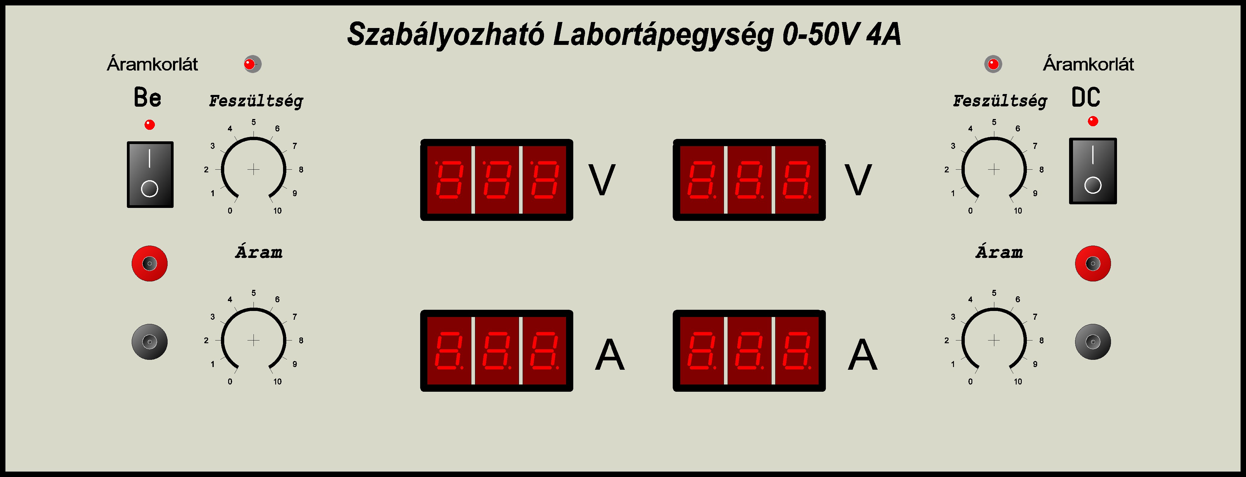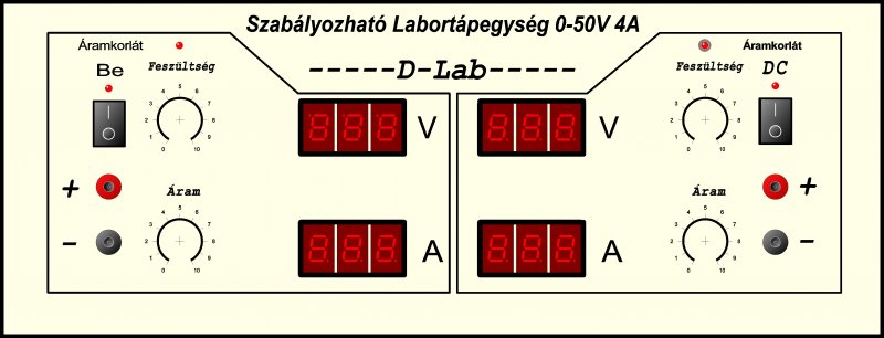 Egyébként igyekeztem úgy megtervezni az elejét, hogy ha lehet könnyen hozzáférhető és jól átlátható legyen majd a műszer, az elején úgy akartam, hogy felül vannak a kijelzők, de ez technikailag nem tudtam kivitelezni, így maradt ez a felosztás, gondolkodtam azon is hogy nem tükörszimmetrikusan tervezem, de az meg úgy nézett ki, mintha két egyforma tápot helyeztem volna egymás mellé, inkább akkor maradjon így, ez így egy műszernek néz ki.