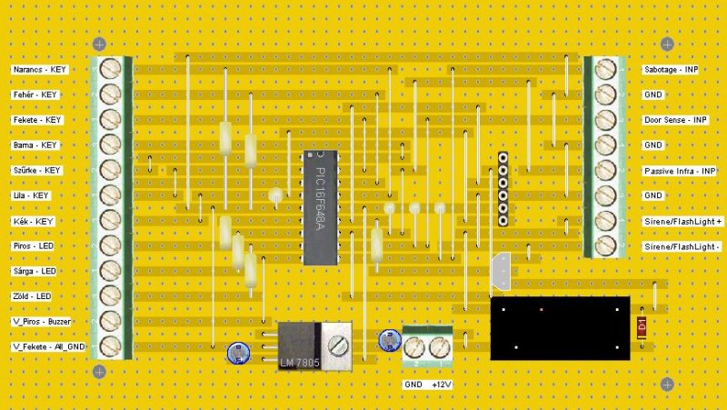 Tudom nem nagy dolog, de én is csinálgatok valamit. Ez végülis az első komolyabb PIC-es projektem. Pinkódos, három zónás riasztó, LED kijelzővel. Mondjuk ez még csak a panel, de ez is merőben különleges szerintem. Stripboard (Joly Joker panel), a felesleges sávok szépen le vannak marva. Az alaktrészoldalon pedig ott figyel a nyomtatott beültetési rajz. A fényképek elég szutykok lettek, de azért a téma érzékelhető. Ugye?!?