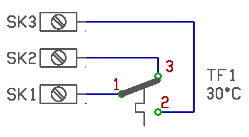 Itt a belső mikrokapcsoló, Morse típusú, tehát váltó érinkezője van. A beállított hőfok alatt 1-es és 3-as kontaktus zár, felette pedig az 1-es és 2-es.