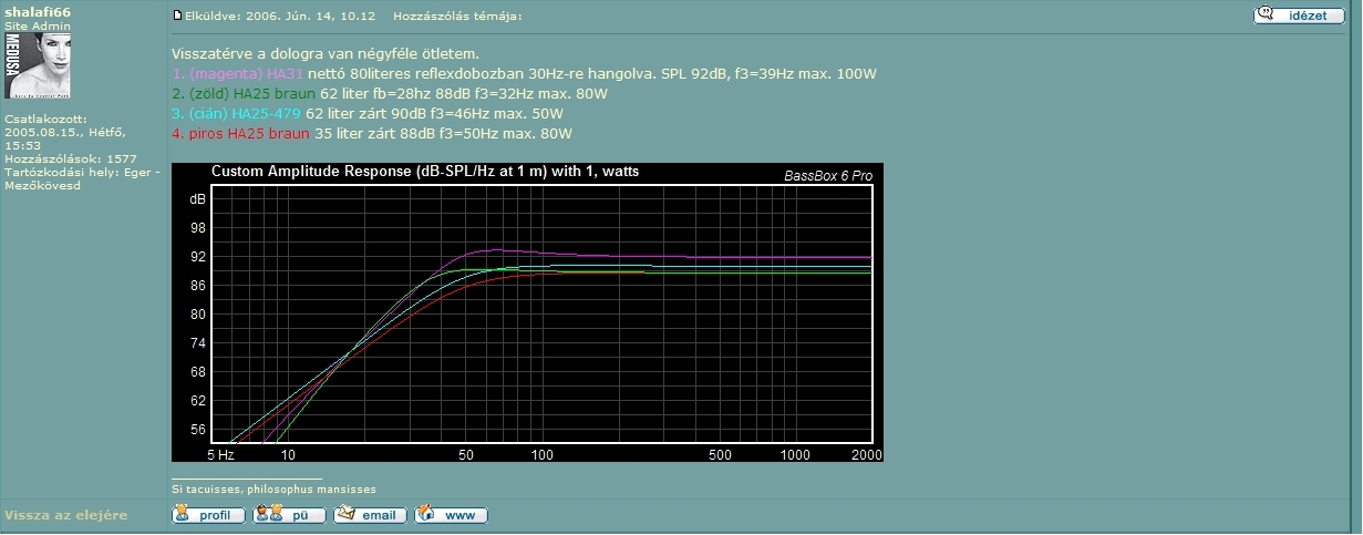 Ha25 braun, shalafi számolt hozzá 62l-es ládát, reflexszel... ELég jó az átviteli görbéje is, sőt... 90dB A hangszóró maga 100/180w, de ő azt mondta így 80-at tud, korrekt mert nem kamuzik többszáz wattokkal, csak azt írja, amit le is ad... Meg érdekes, hogy itt a legnagyobb hsz is csak 100W, de 31 cm, máshol 250W nál kezdődik, aztán 20-25ös a hsz... Engem nagyon meggyőztek Én a másodikat csinálom... 4ohmos változattal |