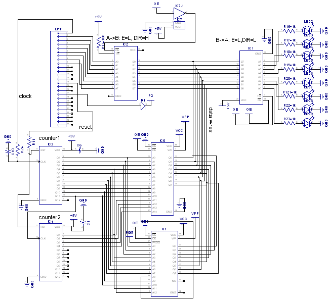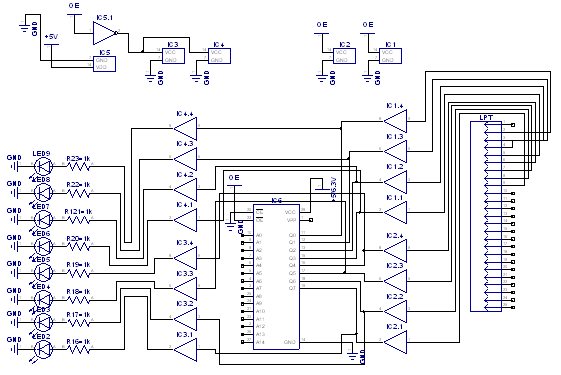 Az a helyzet, hogy az EPROM kimenet sztem nem bírja el a LED-et: ahogy az egyik adatlapban néztem, ha low a kimenet, akkor 2,4mA-t tud nyelni, ha high, akkor csak 400uA-t tud kiadni. Következésképpen, az összes kimenetre kell a buffer (Te ismétlőnek hívod) és azzal kell a LED-eket meghajtani. Az LPT felőli buffer mehet a bemenetekre, és ha nem zavar hogy a LED-ek mindig villognak, akkor így jó lesz. Arra gondolj, hogy a 07-es az open kollektoros, tehát felhúzó ellenállások kellenek.