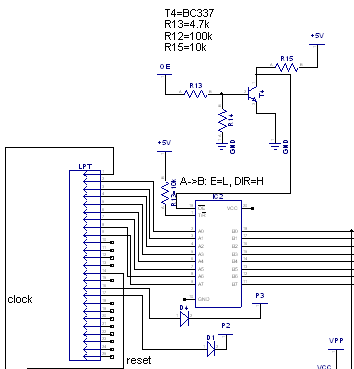 Igen, a +felé kell felhúzni az összes kimenetet, hiszen csak "lefelé" tud húzni a kimenet a 07-nél. Ez a LED-eknél előny, az LPT felőli működésnél hátrány, mert a felhúzó ellenállást is kell hajtania az EPROM kimenetnek. Ezért javasoltam a buszmeghajtót (LS245) az LPT felől, mert ez 8bites és tri-state, tehát kikapcsolható a kimenete (3.állapot=high Z) olyankor mintha ott sem lenne.