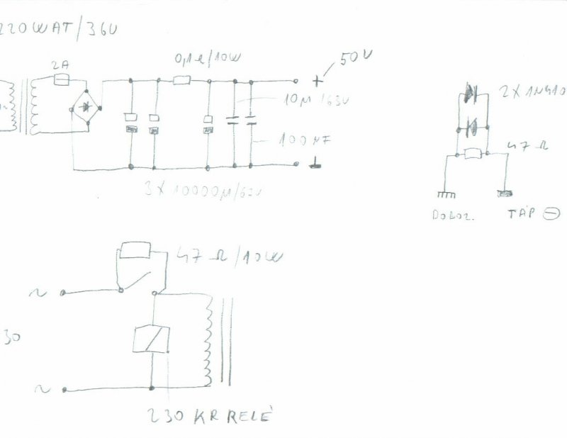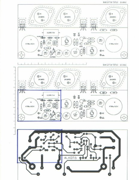 Szia először is a végéről indulok ,ahogyan írod 100Wattos trafód van !Valóban elegendő egy csatornára ,de nem 1,7 amper nyugalmi árammal.Ha ezt akarod használni akkor szerintem mintegy 1,3 - 1,4 nyugalminál följebb nemfogsz tudni menni! Ahogyan Vendelkirály is megfogalmazta ezt a technikát valóban "oroszosra"kell építeni ill az alkatrészeit!úgykell vele számolni hogy mindenből drasztikus túlméretezés legyen.Értem azt a hűtőbordákra ,és természetesen a trafókra is.Nekem kettő darab 220 Wattos trafó van bent mint látszik,S bátran kimerem jelenteni hogy ez az alja.Szóval csatornánként 4 Amperes trafó és ez így is melegszik,egy egész napos járatás után kb 30 fok.Hát igen ha bezárjuk a doboz fedelét akkor meg Majd fogja a belső alkatelemeket is fűteni. A táppal kapcsolatban meg azt tudom mondani hogy nem biztos hogy kell ez neked ez a dolog szinte csak a trafó fügvénye!Deha visszalapozol a fórumban akkor fölfedezheted ezt ,már megvitattuk:nekem is kényszer megoldásként jött a képbe.A lágyindító is csak akkor kell ha az össz trafód min 400W-500W ,szóval ezsem létfontosságú!Én a nyákokat nem tervezgettem , csúnya szóval mondva kimásoltam az alkotó által tervezett panelrajzról ,és ezt vegyítettem az én alkatrészeimmel.Nagyon egyszerű úgymond paraszt tervezéssel .Ez gyors és jó megoldás,Azért mellékelem a lopás tárgyát , ez ceruza piszkozat csak!!! Üdv Benus L