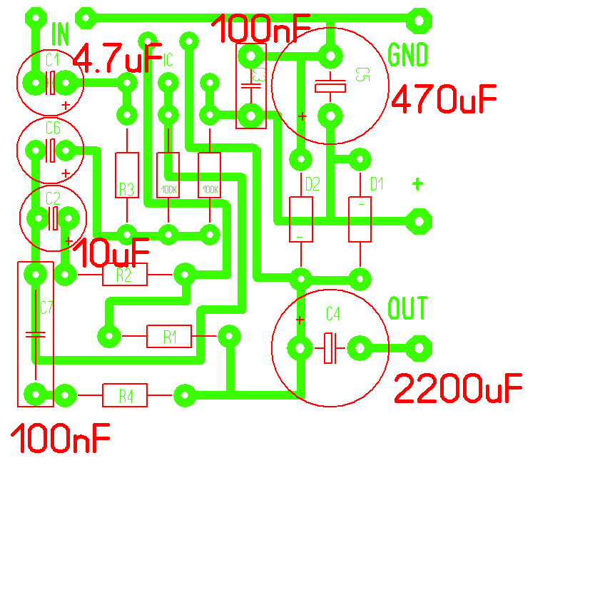 a kondiknál a legnagyobb a 1000µF-os, a kisebb a 470µF-os de a többi három közül melyik melyik? és az ellenállások értékei se tiszták. a diódákat meg az ic helyét már megtaláltam. bocs de ez lesz az első nyákom! és potit hogy kössek rá a hangerő-szabályzáshoz? jó lesz neki 35W-os szélessávú (vagy mi a fene) hangszóró?