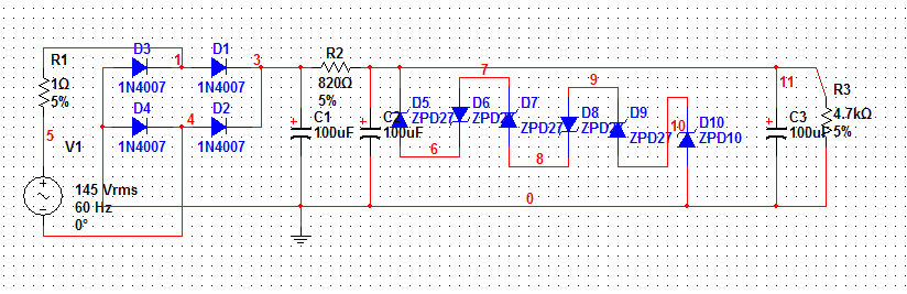 145 V eff AC feszültségre terveztem egy tápot neked, nem túl jó, de nagyon egyszerű, és könnyen feljavítható. A szimuláció szerint 65,8 mA terehelésnél 33,3 mV a búgás, 144,8 V-ot ad le, míg 30,9 mA terhelésnél 30,9mA a búgás és 145,4 V-ot ad le. A parméterek javíthatók: - A búgás javaítására a kondenzátorok kapacitását érdemes növelni. - Ha azt szerentéd hogy a terhelés változására (bár szerintem egy előfoknál a terhelés körülbelél állandó) a kimeneti fezsültség kevéssé változzon, használj nagyobb teljesítménybírású Zénereket, és a 820 Ohmos ellenállást cseréld. A zénekeret célszerű nagybb mennyiségben venni és összasdogatni a 145-ö V-ot, a angy szórásuk miatt. Ugyanúgy a 820 ohmos ellenállást célszerű finomrahangolni egy másikkal. Apropó, az előfok csöves cucc, hgoy iylen nagy feszültség kell neki? Mert ha csöves akkor ajánlanám a VR150 stabilizátorcsövet, amivel nagyon könnyű egy állandó terhelésű cuccra 145-öt levenni. Bár lényegiben ugyanúgy viselkedik mint egy zéner, de csodaszép szineket ad (ami egyben feledteti a 400-500 forintos árát is)