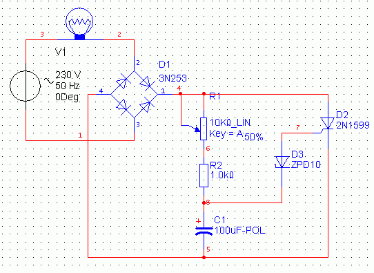 Legegyszerűbb kapcsolás fázishasításra egy tirisztor segítségével. Az egyes elemeket természetesen dimenzionálni kell!