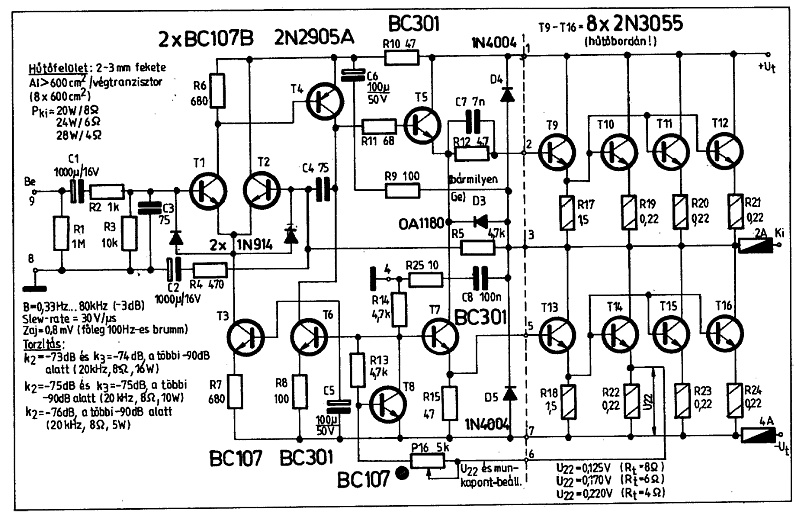 Én sem találok jobb helyet a kutatásaimhoz. Én olyan elvetemült(eket) keresek, akik rajtam kívül, időt pénzt és energiát nem kímélve megépítették ezt az erősítőt, vagy akár csak olyat, aki már hallott olyan valakiről, aki elkövette ezt. A rajz egy példánya mellékelve, de pontosan ez, jópár helyen megjelent már, pl. az 1980-as RTÉK-ban is, ami az első megjelenése volt. Éppen ez bátorított fel engem, hogy próba nélkül, mindjárt kész projektbe fogjak. Láthatjátok, hogy szépen megépítettem, de ez a kapcsolás NEM MŰKÖDIK!!! Pontosabban nagyon furcsán. Az áramok jól beállíthatóak, így mint kályha már jó lenne, de nagyon halkan szól, és akkor is iszonyú rossz hangja van. Nos szeretnék konzultálni olyanokkal, akik szintén belefutottak a csapdába, vagy esetleg olyanokkal, akiknek jól működik ez a kacat. (Elsőre talán zárjuk ki, hogy elkötöttem, meg rosszak az alkatrészeim stb. Túl azon, hogy precíz vagyok, ezen már rég túl vagyok) Aki tud segíteni, az értelmet adna vagy 30000 Ft-nyi alkatrésztemetőnek, és a spec. trafót még nem is számoltam, mert az másra is jó lehet még.