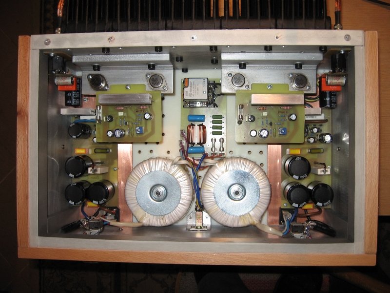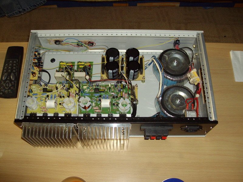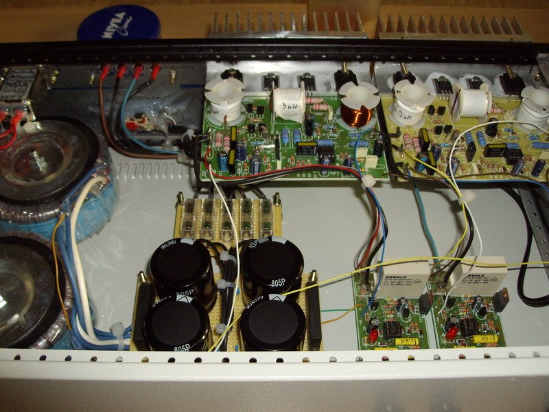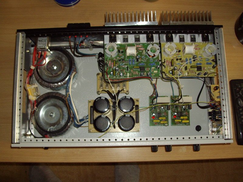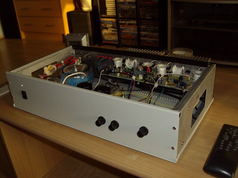 Szia! Egész szép kis erősítő. A kábelezésre egy kicsit tényleg jobban odafigyelhetnél, gondolok itt a kimenetek vezetékeire az erősítőtől a koppanásgátlóig, lehetne vastagabb is. Még valami, a trimmereket nem hangerőszabályzásra találták ki, oda vegyél inkább rendes potmétereket.