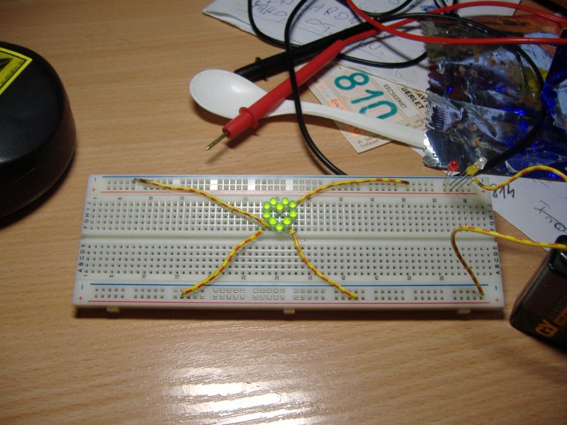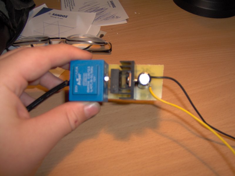 Elkészült az 1,8-wattos kis tápom tartalma:led,1k-ellenálás,egyenirányító,7805,hütőborda,3300mf-os kondi.