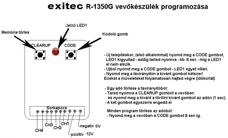 A vevőre a távot úgy kell betanítani, hogy a vevő programozó gombját (CH1 vagy CH2, attól függően melyik csatornára akarod) meg kell nyomni röviden, majd ezután a távvezérlő gombját kell megnyomni, és tartani kb 3 mp-ig. Ha a kódot törölni szeretnéd, akkor 8 mp-ig kell tartani a vevő programozó gombját. A HSE-2 emlékezetem szerint ugrókódos, de lehet egymáshoz tanítani őket. Tedd őket közvetlenül egymás mellé háttal. Nyomd meg először annak a távvezérlőnek a gombját, amiről meg akarod tanítani a másikat. Kb 1 mp múlva nyomd meg annak a távvezérlőnek a gonbját amibe a kődot át akarod másolni. Kb. 3-4 mp múlva elengedheted mindkét gombot.