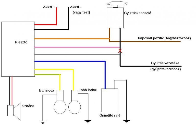 Ez többé kevésbé tiszta is lenne csak azt nem értem hogy ha ugyebár a kéket rákötöm az önindítóra (gondolom az önindító reléjére mert ugye alapesetben fék nélkül nem indul el így azt ki kell kerülni) akkor a szürke és a rózsaszín hova megy?