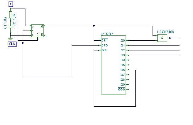 Ez után már csak a 4017 "dolgozik" 1,2,3,4 reset módon. Lehet ha ilyen fontos a pontos működés a 4017 resetjét is valahogyan meg kell oldani tápfeszültség megjelenésekor.(esetleg két diódával vagy egy plusz kapuval meg egy RC taggal.) A kapcsolás csak elvi rajz a szintek nem biztos hogy jók.