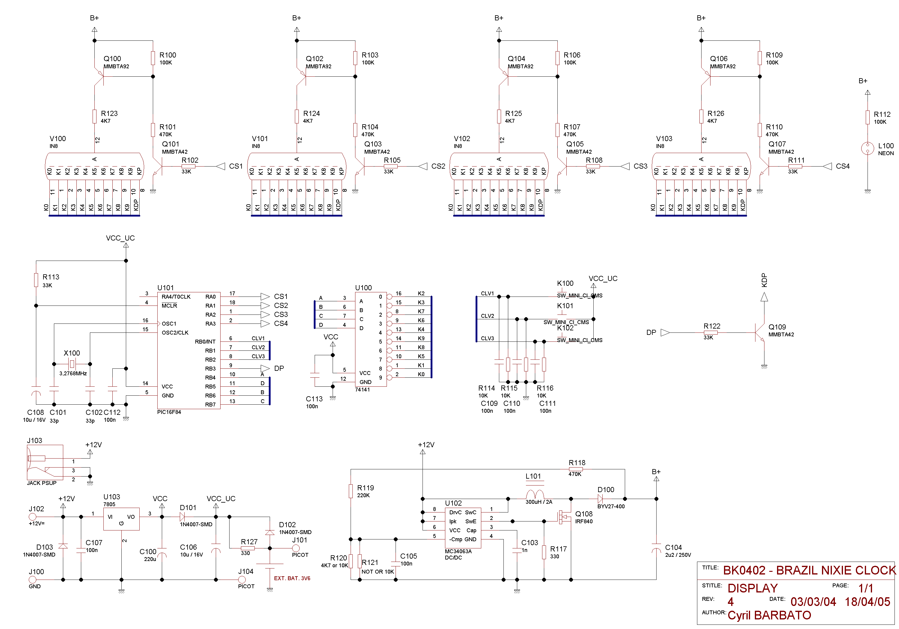 Nem igazán tudom elképzelni, hogyan lehet különböző kijelzés a +- és a -+. Valamint szintén érdekel, hogyan gondoltad megvalósítani a teljes órát két egész darab szimbólumcsővel. Esetleg azt lehetne megcsinálni, hogy egy számot a két csövön jelenítesz meg, és ezt a karaktert lépteted perc egyesek - perc tízesek - óra egyesek - óra tízesek között, amolyan BigClock szerűen. A diódahálózat azért szükséges a 74141 után, mert ha két szimbólumot egy kimenetre kötsz, azokat közösíteni kell, tehát azok már csak együtt tudnak világítani, még ha mást is akarsz kijelezni a csővel. Ezért kell mindenképpen beépíteni őket.... Üdv, Tom