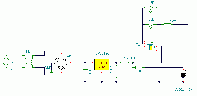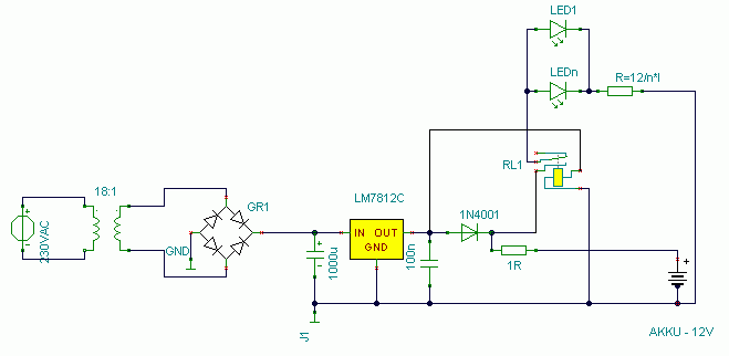 Az átkapcsolást könnyedén egy relével megoldható. Alaphelyzetben húz a relé és tölti az aksit, ha meg kiesik akkor egy másik érintkező páron keresztül meg világítanak a ledek.