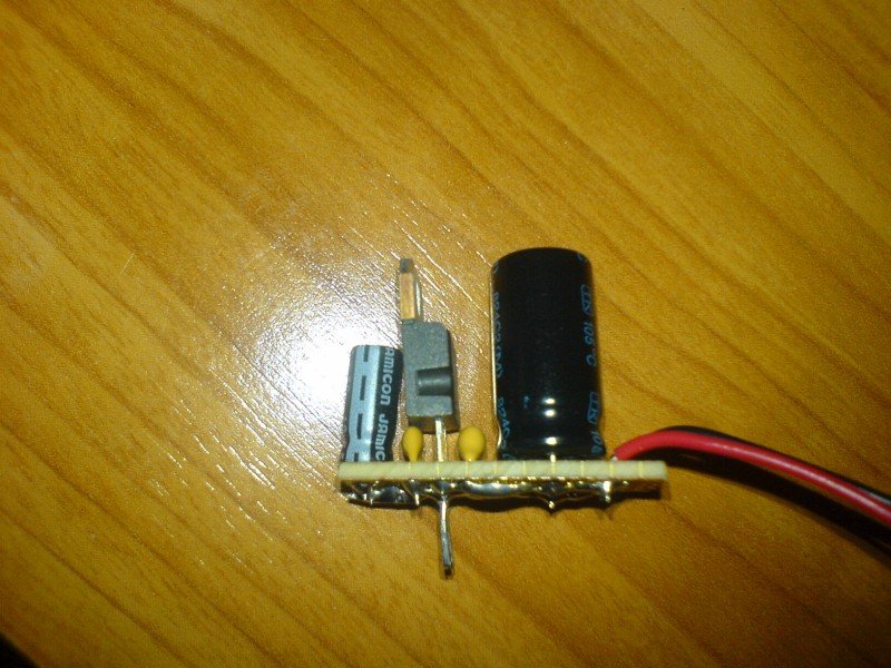 Ügyes kis szerkezet! Az egyenirányító híd védelmi szempontból nem rossz dolog, főleg ha nem mindig ugyanarról a forrásról táplálod, meg akkor akár egy csengőtrafóra is rákötheted (váltóáram). Az elemes táplálásnál a ledet nem annyira tartom jónak (energiapazarlás). Viszont ha nagyobb terhelés is lehet, nem árt egy olyan lemezből hajlított kis hűtőbordát rátenni, mint amit a csatolt képen rajzoltam.