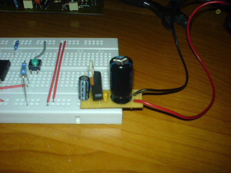 ![]() Nem nagy cucc, de pont ez benne a lényeg. Minden rajta van ami kell. Egyszerű lyukacsos próbapanelra építettem rá. Az LM7805 két lábát meghagytam és azt kell beledugni a breadboradba. 9V-os elem csatlakozó van rákötve, így elemről, ill fali dugaszról is üzemel. A 2.0 verzióba már raknék rá egy led-et is, esetleg egy egyenirányító hidat