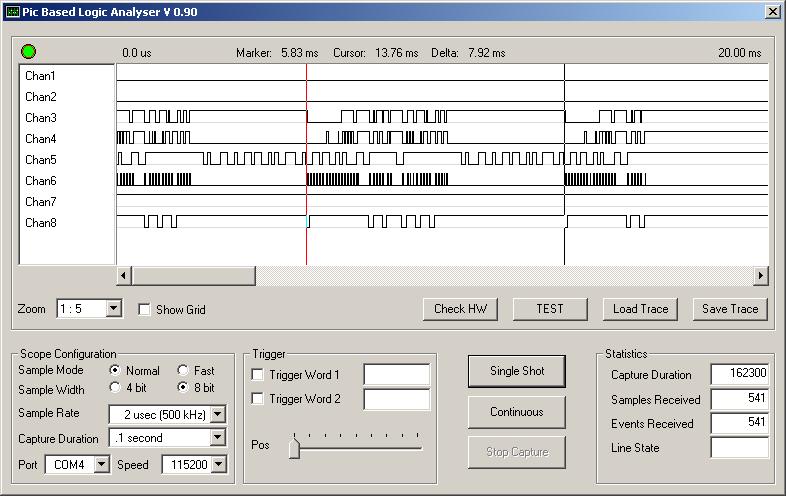 10Mhzen ketyeg a pic maximum 2us mintavétellel 8csatornán. Sajnos a pic buffere kicsi ezért maximum mintavételezési sebességnél csak pár tizedmásodpercet tud "rögzíteni".