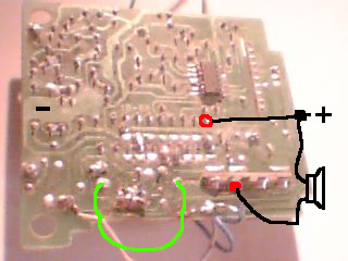 Ezek igazából nem az én képeim, hanem az egyik fórumtársé, és csak bejelöltem neki, amit kért. Szóval a tápot megtudom mutatni, de a hangszóróban nem vagyok biztos. Ha megnézed az alkatrész oldal felőli képet, ott látsz egy kettős tüskét, +,- jelzésekkel, oda megy a táp, érteelemszerűen. Aztán van két másik, ezek "egyes" tüskék, na oda mennek a hangszóró vezetékei. Na, biztos ami biztos, rajzoltam... Üdv!