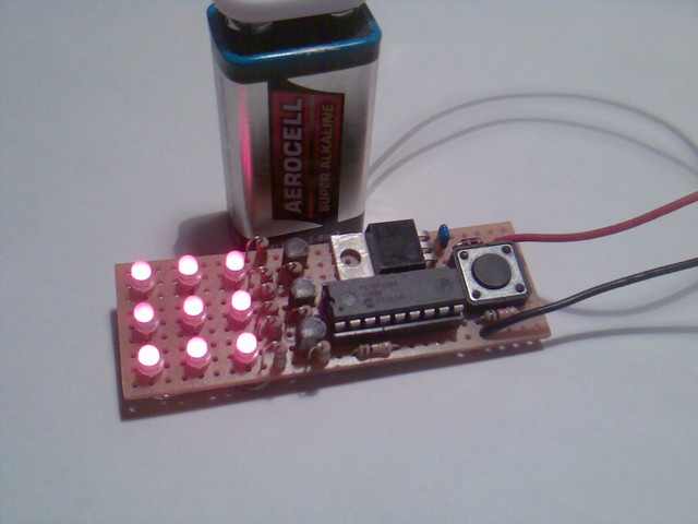 A héten építettem ezt a ledes villogót. 9 darab duoled (piros/zöld) van mátrixba kötve, amit egy Pic16f628a vezérel. A gombbal lehet váltani az effektek között, az utolsó után pedig kezdi elölről (kikapcsolni sajnos nem lehet )Most 6 effektet tud, de később írok még rá párat.