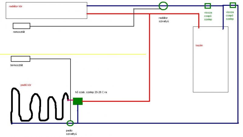 Sajnos hasonló cipőben járunk. Sajnos nem értek ezekhez a dolgokhoz. Szeretném megkérni minden kedves olvasot, hogy írja le a véleményét erről a problémáról, megvalósításról Most költöztünk be az uj házunkba, és egy olyan problémaval szembesültem amire nem nagyon tudok megoldást találni, bár van egy ötletem, csak nem tudom, hogy mennyire valósítható meg. A probléma az, hogy van egy átfolyos kazánom ami melegíti a radiátor és padlófűtés vizét. A padlófűtés rendszerére rávan kötve egy keringető szivattyú amit egy csőtermosztát vezérel. A lakásban 2 db termosztát van az egyik egy radiátoros szobában a másik pedig egy padló fűtéses nappaliban lett elhelyezve. A gondom az, hogy úgy működik a rendszer, hogy mikor bekapcsol a kazán és a kimenő ágon eléri a 30 fokot akkor indítja be a keringető szivattyút, de mikor elég meleg van a szobai termosztátnál, akkor kikapcsolja a fűtést és elég hamar kihűl a kazánból kimenő ág ekkor kikapcsol a keringető szivattyú is, és a padlő ennyi idő alatt nem tud felmelegedni. A másik problémám pedig, hogy ha jól tudom nem szabad 30-40 foknál többet beengedni a padlófűtés rendszerbe, viszont akkora hőfokú víz megy bele a padlófűtésbe mint a radiátorokba. Az ötletem ez lenne: A kazánból kijövő csövekre egy-egy szelepet amit egy-egy relé vezérelne. Gondolom valahogy így működne: Amikor jelet ad a szobai termosztát akkor kapcsol a kazán és nyitja a radiátorok felé menő cső szelepét e-közben zárva van a padlófűtés szelepe. A működése pont ellenkező, ha a padlőfűtés termosztát kapcsol. Ha mindkettő termosztát kapcsol akkor kinyit mindkettő szelep. Viszont a másik gond, hogy nem tudom, hogy hogyan lehetne szabályozi a padlófűtés rendszerbe bemenő víz hőfokát. A segítségeket előre is köszönöm. Üdv.