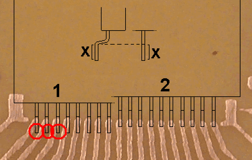 Másrészt ha tssop vagy egyéb 9000lábú felülszerelt alkatrésznek akarsz nyákot csinálni akkor ügyelj arra hogy az alkatrész lábai teljesen rajta legyenek vezető sávon. Azt a részt aminek mindenképpen fel kell hogy kerüljön a vezető sávra Xel jelöltem. Ha csak rövid rész van rajta (2) akkor nem megfelelő stabilitást ad. A kis területre nagyobb erő hat ezért a nyákon levő vezető réteg felszakadhat!