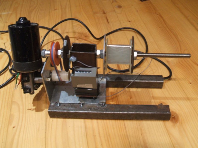 .Bosch ablaktörlőmotor,reedrelés számláló,levegős sarokcsiszóló korongja(cséveösszefogó),a felső gumikerék meg valami építőkészletből van. Agyagköltség:0ft,mindent a garázsból bugáztam ,ja,a hegesztőtrafó 2000ft,vastelepes,újra lakkoztam a cekászt és megyen ezerrel(igaz kicsit meg van pörkölődve...),Ehinel cen,vagy micsoda,bútorlapból csináltam neki dobozt .